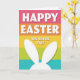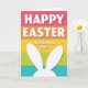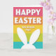 This greeting card features a modern graphic layout with wide horizontal color bands, shifting from deep rose pink at the top through orange and yellow, then down into lime green and cool teal near the bottom. Across the upper area, large white lettering sits centered with a faint shadow that helps it stand out against the stripes, like a confident greeting said with a grin. Just beneath, a smaller white line of text adds a cheeky nickname, giving the design the kind of teasing warmth you might share with a close friend or someone you’re flirting with. In the lower half, a crisp white silhouette of a long-eared bunny 🐰 rises up, its ears stretching into the color bands as if leaning in for attention. The sharp edges of the animal shape contrast with the smooth, flat background, keeping the look graphic and tidy without feeling cold. The spacing leaves plenty of breathing room so the words read clearly while the bunny remains the main visual anchor. A tiny 🌷 touch in the overall spring palette comes through in the pink and green bands, while the bunny’s tall ears cut cleanly upward into the bright stripes. The white bunny silhouette sits centered near the bottom, with its ears reaching into the yellow and green bands beneath the smaller text line.