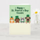 Designed with soft green tones, this digital illustration shows four friendly animal characters lined up across the middle, leaning close together like pals sharing a quiet laugh 💚. An orange cat, a brown dog, a gray cat, and a tan-faced dog peek over a wide cream banner at the bottom, their paws resting along the top edge as if they’re inviting you in. Their big eyes and gentle smiles suggest easy affection and a cozy, companionable mood. Two of them wear green top hats—one with a gold buckle—while the other two sport neat green bow ties, adding a festive touch ☘️. Near the top, an emerald-green holiday greeting is set in thick, easy-to-read letters, with small shamrock shapes tucked around the words. The background fades from pale lime green to a lighter green glow, keeping the scene soft and airy. The cream banner below is left blank for your own note, contrasting clearly against the green backdrop. Tiny shamrock accents sit near the headline, and the hats and bow ties match the same deep green used in the text.