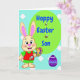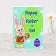 This card shows a cheerful cartoon bunny on the left, smiling with rosy cheeks and pink-lined ears, dressed in a green top and a red smock while holding a painter’s palette and brush 🐰. The bunny faces forward with an inviting, friendly look, as if ready to create something sweet for someone special. On the right sits a large lime-green oval that frames the greeting text, set in blue lettering that curves neatly across the center of the oval. Two tiny striped flying insects hover near the words, adding a light touch of motion around the message 🌷. In the lower right area, a purple decorated egg rests as a seasonal accent, patterned with wavy and geometric bands in cooler tones. Everything sits on a soft aqua background scattered with small white diamond shapes that feel like gentle confetti. The lime-green oval and blue text stand out strongly against the aqua field, with the bunny’s red and green outfit balancing the color across the layout. The purple egg features layered stripes and zigzags, and the bunny’s palette shows multiple paint spots in different colors.