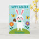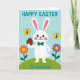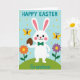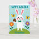 Designed with a flat, graphic look, the card features a white bunny 🐰 centered on the front, with long ears lined in pink and a wide smile that feels like it’s meant for someone close. Its black eyes, tiny red nose, and rosy cheeks pair with an emerald green bow tie, adding a sweet, friendly charm. One paw lifts a dark brown egg-shaped treat, angled slightly upward as if showing it off to a favorite person. The bunny stands on a gently curving green hill beneath a soft blue sky sprinkled with many small yellow dots like confetti. On either side, two simple spring flowers rise on thin green stems—one orange and one purple—with bright yellow centers, and two small golden-winged insects drift nearby 🐇. The greeting text appears in large, rounded letters near the top in a light, cheerful color, with a second line in smaller lettering placed below or beside it to address a young male family member. The background stays uncluttered, with the blue sky, yellow dots, and green hill forming a clear frame around the bunny and flowers.