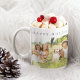 Simple minimal stylish red typography Happy Holidays funny family pictures create your own Christmas coffee mug with custom 2 photos, name, year, and your text.