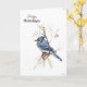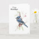 Happy Holidays with painted watercolor blue jay bird with berries. Art by Jenn Steffen, Jenn's Emporium.