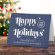 Blue corporate business Christmas card for your customers, employees, affiliates, etc., featuring "Happy Holidays" in stylish white serif typography, your company logo and name in simple modern typography. On the inside, add a seasonal message of appreciation and thanks and input your website address to create a QR code that customers can scan to access your online platforms.