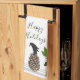 This design features three penguins among various symbols of the winter season: a snowflake, pine cone, and holly. The humorous animal illustration with personalized text makes a cute funny and unique kitchen towel.