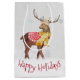 Big buck deer in snowflakes with winter scarf and red Happy Holidays text on silver snowflake background.