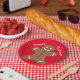 Paper plate with rich red color, decorated with a sweet gingerbread character and "Happy Holidays" in white.