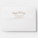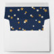 Pre-addressed holiday envelope with navy blue inside and seamless pattern of gold stars. Return address is in serif font ready for your customization with custom script "happy holidays" in gold. You can change font and color of the script to suit your needs.