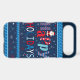 A phone case with a dark blue background, decorated with a festive "Happy Holidays" design. The word "Happy" is written in a playful, colorful font, with each letter having a different pattern: the "H" has red and white candy cane stripes, the "a" is red with white polka dots, the first "p" is red with blue polka dots, and the "y" has blue and white stripes. Above the "a" is a small cartoon Santa Claus figure. The word "HOLIDAYS" is written below in a mix of red, white, and blue letters. The background is filled with white and red snowflakes and stars of various sizes. The top and bottom edges of the case have a decorative border of blue stripes and small white stars.