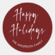 Happy Holidays Modern Christmas Dark Red and White Round Sticker with Script Calligraphy and Family Name