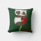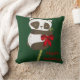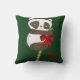 Adorable holiday throw pillow features panda on bamboo with big red festive bow and "Happy Holidays" text. Forest green background, image on both sides of pillow