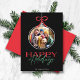 These whimsical 5" x 7" holiday greeting cards feature a photo tree ornament with a red bow. The greeting is, "Happy Holidays," in red, green on a black background with placeholders for your favorite photo, family name(s), and year.