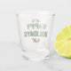 A festive shot glass with the "Happy Holidays" in a green and black checkered type font. At the top and bottom there are a couple of sprigs of holly and red berries.