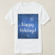 "Happy Holidays" is written in a whimsical font that can be customized to suit your needs. Three delicate snowflakes dance about a blue night sky.