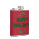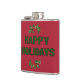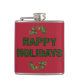 A festive flask with the "Happy Holidays" in a green and black checkered type font. At the top and bottom there are a couple of sprigs of holly and red berries. This flask can be customized.