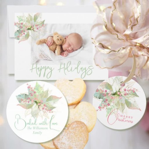 This pastel poinsettia photo Holiday card in blush pink, gold and sage green is so sweet to showcase your family ... Minimal styling with script typography