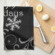 A classic black and white Happy Holidays kitchen towel with white and silver snowflakes and swirls on a black background.