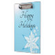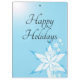 Featuring a blended color pattern of blue and white with pointed snowflake graphics and a "Happy Holidays" message. Change the text, font, color, size and placement for the best experience.