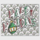 This image is a message that says " Happy Holidays" in white, red and green colors. A lone Christmas ball ornament in green, white and gold is hanging. The same image is tiled as a backround. This wrapping paper comes in an assortment of styles, colors and sizes.