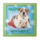 Celebrate the holiday season with a cute little Bulldog puppy sitting in a Santa hat amid snowflakes and the words, Happy Howlidays! Great holiday gift idea for Bulldog-loving family and friends.