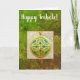 A unique greeting card for Imbolc featuring a Celtic knot medallion on a stone field with a background of vibrant green and gold abstract.