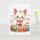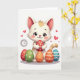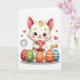 This card shows a cute, human-like kitten centered on a bright white background, with creamy fur, soft tan patches, and a gentle pink blush inside the ears and on the cheeks. Its large dark eyes look straight ahead with a tender, friendly gaze, as if sharing a quiet moment with someone special. The kitten cradles a rich red egg-shaped decoration with small white flowers, holding it close like a thoughtful gift 🌷. Along the bottom edge, several more egg-shaped decorations sit in a neat row, patterned with polka dots, stripes, and zigzags in green, orange, and blue. Soft, diffused lighting gives the shapes a smooth, slightly sculpted look without harsh shadows. Near the top, a few rosy hearts float around the kitten, adding a gentle romantic touch 🐰. A short greeting appears near the upper area in a light-colored font, while a faint gray swirl curls subtly behind it on the white space.
