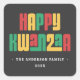 Square Happy Kwanzaa sticker featuring the text "Happy Kwanzaa” in red, green and yellow, with customizable name and year below in white. Dark gray, almost black background.
