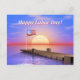 Postcard with my digital artwork of a lakeside scene of a dock, U.S. flag and a setting sun. Text says "Happy Labor Day!"