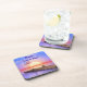 Beverage coaster with my original end-of-summer image of a dock, the American flag, and a setting sun. Customizable text says "Happy Labor Day!"