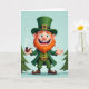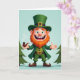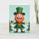 This card shows a cheerful leprechaun centered in the scene, standing tall with a fiery orange beard and bright green eyes that sparkle as if he’s sharing a friendly secret with you 💚. He wears an emerald-green top hat with a gold buckle, a matching coat and trousers, and pointed brown shoes finished with golden laces. Behind him is a soft cerulean-blue backdrop, with simple green trees peeking in from the sides to suggest a little woodland hideaway. In his left hand he holds a small dark pipe, and a thin curl of white smoke rises upward like a gentle ribbon. His wide, open-mouthed grin shows white teeth and a pink tongue, and his raised right hand is open in a welcoming wave that feels like an easy, friendly hello ☘️. The greeting text sits near the top in light green lettering, with a smaller line beneath it in warm gold. Share St. Patrick's Day sentiments with someone you care about, and let the cerulean background and edge-framed trees keep the leprechaun in full focus.