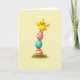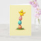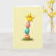 Designed with a sunny, springtime look, this card features a bright yellow baby bird with rosy cheeks balancing on a tall stack of three decorated eggs 🐰. The bird’s tiny wings stretch outward as if steadying itself, and its wide grin gives the scene a friendly, affectionate tone. The stack rises from a patch of rich green grass, with soft shadows that make the eggs feel rounded and smooth. The top egg is pink with zig-zag lines, the middle egg is turquoise with small white polka dots, and the bottom egg is warm yellow with fuchsia stripes. A short Easter greeting sits near the top in a gentle, easy-to-read font, colored in a darker shade that stands out against the pale background. The background stays a calm, light yellow so the foreground colors feel lively without being harsh, and a small 🌷 accent sits near the text. The bird and eggs are centered, with the grassy base along the lower edge and plenty of open space around them. Please enjoy sharing Easter sentiments.