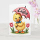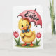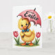 This greeting card features a fluffy yellow baby bird standing on a patch of green grass, its soft feathers and rosy cheeks giving it a sweet, friendly look 🐰. Large blue eyes with long lashes and a wide orange smile create a tender, welcoming expression, like it’s greeting someone special. A neat blue bow tie adds a touch of charm as the bird holds the curved handle of a pink umbrella. Across the umbrella canopy, a short festive message appears in smooth lettering, centered and easy to read in a darker contrasting color. Two pink tulips rise on either side, their petals slightly open as if leaning in toward the bird like close companions 🌷. The white background keeps the focus on the sunny yellows, blush pinks, and fresh greens, with soft lighting that makes the scene feel gentle and springlike. The bird’s orange webbed feet rest at the edge of the grass, with the tulip stems framing the umbrella above.