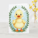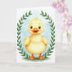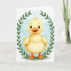 This design shows a small yellow chick centered in the scene, its round shape and soft shading giving it a cuddly look 🐇. Its dark, shiny eyes meet yours with a sweet, friendly gaze, and its orange beak curves into a gentle smile with a hint of rosy blush on the cheeks. A curved wreath of rich green leaves wraps around it like a caring hug, adding a quiet, affectionate mood like a close friend leaning in for a photo 🌷. The background fades from pale sky blue to white, with a light green wash near the bottom that suggests fresh grass. Near the top, simple greeting text sits above the chick in a warm orange tone, spaced neatly so it feels airy and easy to read. Soft highlights and shadows define the feather edges and tiny wings, while the leaf garland shows fine vein details for texture. At the bottom, bright orange webbed feet peek forward against the soft green ground tint.