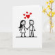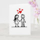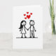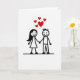 This card shows two simple stick figures, a man and a woman, standing close and holding hands on a plain white background. The woman has long dark hair and a basic dress, and she faces forward with a small, happy smile. The man has short spiky hair, wears simple pants, and smiles the same way as he stands beside her. Above their heads, several bright red hearts float upward, standing out against the black line drawing. A single black line under their feet suggests the ground and keeps the scene feeling centered. There isn’t any written message on the front, so the picture and the hearts do all the talking. It’s an easy, sweet design that fits romance, affection, or close friendship ❤️💌.