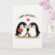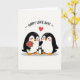 This card shows three penguins standing together on a white background, with two adults on either side of a small chick. The adult on the left holds a bouquet of red flowers with green stems, like a simple way of saying “I care.” On the right, the other adult gently holds the chick close, and the chick has rosy cheeks and wide eyes that look sweet and happy. All three penguins are drawn in black and white with bright orange beaks and feet, and there’s a soft gray shadow under them to help them feel grounded. Above the family, the words “HAPPY LOVE DAY!” curve across the top in black cursive-style lettering, with a red heart placed near the text. The scene feels calm and affectionate, making it a meaningful choice for a partner, friend, or anyone you want to remind they’re loved 🥰❤️. Share it to pass along a little Valentine’s Day warmth and kind feelings.