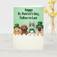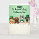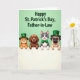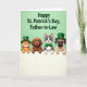 Designed with four cute cartoon pets peeking over a soft white horizontal rail, this St. Patrick’s Day-themed illustration lines up two cats and two dogs shoulder to shoulder as if they’ve gathered close for a friendly photo. The background is a light green field that sets a cozy, affectionate mood, with the animals’ gentle smiles and curious eyes suggesting they’re sharing the moment together 💚. An orange tabby with green eyes grins warmly, while a brown floppy-eared puppy looks on with a sweet, attentive gaze. Next to them, a gray-and-white cat with bright blue eyes wears a small green bow tie, leaning in like a close companion, and a light-furred pug-like dog keeps a calm, tender expression. Two of the pets wear tiny glossy green top hats with gold buckles, adding a festive nod to the day ☘️. The greeting text sits across the top in a darker green, with a St. Patrick’s Day message directed to a family member. The white rail stretches straight across the lower portion, with the pets’ heads and upper bodies rising above it against the light green backdrop.