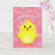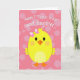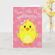 The front design shows a plump little yellow bird standing in the lower foreground, drawn with simple shapes that make it feel friendly and easy to read. Its big black eyes and tiny orange triangle beak face forward, while soft pink cheek dots give it a bashful, affectionate look, like it’s posing for someone it trusts. A pale pink bow with a small yellow dot sits on top of its head, adding a gentle touch that reads like a sweet gift detail. Behind the bird is a bubblegum-pink background filled with lighter, semi-see-through pink polka dots that float across the scene like confetti. Near the top, a rounded white line of text is placed on a diagonal arc, leaning slightly as it stretches above the character. The bright contrast between the white lettering and the pink field keeps the message easy to spot, and the overall layout leaves plenty of open space around the words. A small 🌷 or 🐇 would fit naturally beside the lettering, and the polka dots remain softly layered across the pink backdrop.