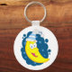 A happy yellow moon face wearing a blue and white hat. This design looks really effective on these Keychain