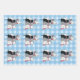 This set of wrapping paper sheets are light blue and white plaid with a happy white mother cat sitting with her three kittens who are black, gray, and white all wearing pretty pink bows.