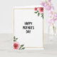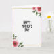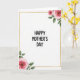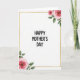 This card features the words “HAPPY MOTHER’S DAY” centered on a bright white background, set in a simple, easy-to-read sans-serif style. The lettering appears in a strong dark tone, standing out clearly as the main focus. A thin rectangular frame in a glittery gold texture surrounds the message, adding a gentle sparkle that feels like a warm hug ❤️. Soft watercolor flowers decorate the design, with pink roses and green leaves arranged to create a sweet, slightly off-balance corner-to-corner flow. The roses show tender layered petals with deeper blush tones tucked inside, like a quiet sign of affection and closeness. The text sits comfortably within the border, with plenty of open space that makes the florals feel like thoughtful little touches rather than clutter. In the upper right and lower left corners, the pink roses bloom beside leafy green sprigs, with the gold frame tracing neatly around the edges 🌼.