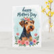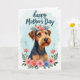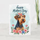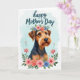 This card features a sweet portrait of a friendly dog with two-tone fur, where deep dark shades blend into warm golden-brown on the face and legs, and a softly shaggy muzzle adds extra charm. The dog’s dark, gentle eyes look forward with a tender, affectionate gaze that feels like a quiet bond shared with someone special ❤️. A delicate flower crown rests on its head, mixing pink and coral blossoms with soft blue petals and small touches of leafy green. More flowers gather along the lower edge, framing the dog like a bouquet offered with care, with airy watercolor-style textures and varying blooms. The background is a light blue wash that softly fades toward the edges, keeping the scene calm and airy. Near the top, the words “Happy Mother’s Day” sit centered in flowing teal lettering, standing out clearly against the pale backdrop. Small petals and leafy sprigs add gentle color contrasts around the crown and the bottom floral border 🌼. The lower arrangement shows layered blooms in pink, coral, and powder blue, nestled among green leaves across the bottom of the design.