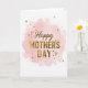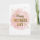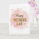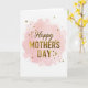 This greeting card features the words “Happy Mother’s Day” centered in the design, with “Happy” placed above “MOTHER’S DAY” in two contrasting lettering styles that feel like a gentle embrace ❤️. Both lines of text appear in a warm, gold-toned finish that looks lightly speckled, as if dusted with tiny flecks that catch the light. Behind the message sits an irregular, cloud-like shape in soft pastel pink, with feathered edges that give the scene a tender, airy look. Small gold circles are scattered around the pink shape and out onto the white background, like confetti drifting between close friends at a small celebration 🌼. The white space around everything keeps the layout open and calm, letting the gold and pink feel intimate rather than loud. The text stays clearly centered while the scattered dots create a loose frame that draws your eyes back to the middle. The pink wash sits like a soft halo behind the gold lettering, and the gold dots vary in size across the top and sides.