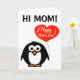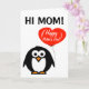 Happy Mothers Day greeting card with cute penguin holding a red heart balloon.