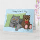 Cute grey cat with toy and teddy bear wishing their cat Mom a Happy Mother's Day. Happy Mothers Day form the Cat