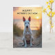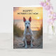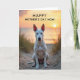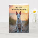 This greeting card features a white, slender dog with long legs sitting calmly on a sandy dune, its posture poised and its gaze steady as if watching over someone it cares about ❤️. Backlit by low sun, its large ears glow softly at the edges, and its warm golden eyes add a gentle, affectionate focus to the scene. Wispy dune grasses lean in the wind around the dog, giving the setting a quiet coastal feel that suggests closeness and care without needing any extra characters. Behind it, the ocean lies smooth and still while a bright sun hangs near the horizon, washing the sky in layered oranges, pinks, and faint purples. The light skims across the dog’s coat and the rippled sand, creating a tender, romantic calm, like a shared moment held in silence. Near the top of the design, the message “HAPPY MOTHER’S DAY MOM!” is set in dark lettering that stands out clearly against the glowing sky 🌼. The words sit centered above the dog and sunset, leaving the shoreline and soft color gradient unobstructed beneath them. The sun appears as a glowing circle just above the waterline, with the brightest band of light stretching across the ocean toward the dune.