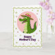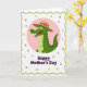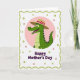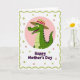 This greeting card features a friendly, human-like reptile character in emerald and olive green, smiling wide with bright white teeth and a deep magenta mouth that gives it an affectionate, welcoming look ❤️. Its large, expressive eyes seem to glance outward with the kind of warmth you’d share with someone close, like a gentle inside joke between friends. A straw hat sits slightly tilted on its head, wrapped with a rich fuchsia band and topped with two matching flower accents for a sweet, sunny-day feel 🌼. The character is framed inside a soft circular pastel pink area that softens the scene and makes the green tones feel even more tender. Everything sits on a white background bordered by a wavy light-green line that adds a relaxed, breezy edge. Small polka dots in pale green and light pink scatter around the border like confetti. Near the bottom, the words “Happy Mother’s Day” appear in dark purple lettering, centered beneath the portrait. The border’s wavy line is light green, with pale green and light pink dots spaced around the outer area.