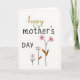 Designed with a minimalist white background, this Mother’s Day design centers on a warm greeting that feels like a gentle hug ❤️. The word “happy” sits near the top in a flowing warm-gold cursive style, giving the lettering a soft, affectionate look. Just below it, “mother’s DAY” is set in a rounded black sans-serif, with “DAY” in uppercase for extra emphasis. Along the lower area, three floral groupings rise like a quiet bouquet offered in friendship and care 🌼. On the left is a single light-pink flower with a sunny yellow center on a thin green stem, followed by a small spray of blush blossoms on a dark stem with earthy brown leaves. The tallest cluster reaches up on the right with two larger pink blooms featuring dark, detailed centers, branching from a stronger dark stem with matching brown leaves. The petals have a lightly painted texture, and the flowers frame the text with soft pinks, greens, browns, and warm gold against the bright white space.