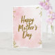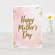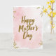 This greeting card features the words “Happy Mother’s Day” centered on a bright white background, written in flowing lettering that feels like a gentle embrace ❤️. The text appears in a warm golden-brown tone, giving the message a cozy, treasured look without overpowering the page. Behind the wording sits a soft pink watercolor wash, like a light blush of color that frames the message with quiet affection. The pink shape has uneven, cloud-like edges, adding an airy, tender atmosphere that suggests closeness and care. The layout keeps the phrase as the clear focal point, with generous white space around it so the eye lands on the greeting right away. Small decorative sprigs in the same golden-brown are placed near the corners, echoing the warmth of the lettering and hinting at a gentle floral touch 🌼. The overall palette stays simple and soothing, with white, blush pink, and golden-brown working together like a calm, loving moment shared between family. Four twig-like accents sit subtly in each corner, angled inward toward the center.