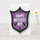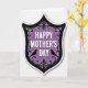 This card features a shield-shaped emblem that draws your eye straight to the center, where “HAPPY MOTHER’S DAY” appears in bright white lettering. The message sits on a deep purple background that shifts from darker edges to a softer glow near the middle, creating a gentle, affectionate warmth ❤️. A wide black border surrounds the shield, filled with flowing curls, dotted accents, and vintage-style flourishes that feel like a careful embrace around the words. The ornate lines curve and loop like intertwined ribbons, adding a quiet romantic touch through their closeness and symmetry. At the bottom corners inside the purple area, two small bird silhouettes face inward as if sharing a calm moment together 🌼. Their feet rest on slim, stylized branches that extend from the decorative border and angle toward the center. The overall look is dominated by rich purple tones, crisp white text, and detailed black scrollwork with the paired birds perched low on either side.
