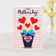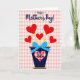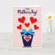 This design shows a dark blue vase-like container holding five red heart shapes outlined in white, each rising on a thin yellow stem like a small bouquet ❤️. A light blue bow with tiny white polka dots is tied around the container, adding a sweet, friendly touch as if it’s been carefully wrapped for someone close. On the front of the container, a large heart patch in a red-and-white gingham pattern sits like a cozy badge, with the word “Sis” printed inside in dark blue. The background is a soft blush check pattern that feels like a picnic cloth, setting a homey scene where affection is shown through simple details. Near the top, the greeting “Happy Mother’s Day!” is placed above the bouquet in dark blue lettering, standing out clearly against the pale backdrop. The mix of deep blue, bright red, and sunny yellow creates a cheerful contrast, like a warm hug between family members 🌼. The hearts tilt slightly in different directions, and the bow’s loops and trailing ends sit neatly against the container.