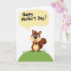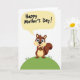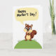 This card shows a cute, human-like woodland animal centered on a gently curved green hill, drawn in warm brown and creamy beige tones. Its big black eyes look straight ahead with a tender, friendly openness, and a tiny pink tongue peeks out from a small smile ❤️. With both paws, it holds a dark acorn close to its chest, like a small gift being offered with care. In the upper left area, a soft yellow speech bubble arches over the scene, carrying the message “Happy Mother’s Day!” in thick, rounded black lettering. The background stays bright white, making the greens of the hill and the earthy colors of the character stand out clearly. A few simple green sprigs dot the hill, adding a gentle garden touch 🌼. The yellow speech bubble sits above and slightly left of the character, while the hill stretches across the bottom edge with the sprigs spaced lightly along it.